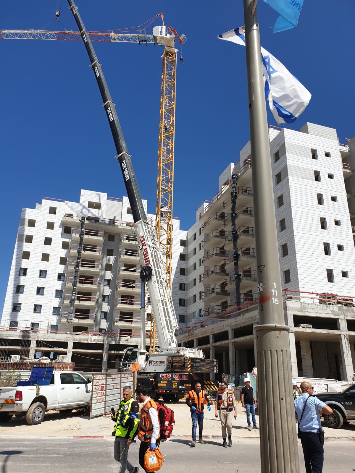 פראמדיק מד"א אלון מלמה סיפר: "מדובר באתר בניה גדול עם 2 בנייני מגורים שבמרכזם עומד מנוף, חלקו האחורי של המנוף התפרק וקרס על הקרקע. 3 פועלים שהיו בסמוך נפגעו באורח קשה מאוד בכל חלקי גופם, תוך כדי פעולות החילוץ שלהם ביצענו בדיקות רפואיות אבל הם היו ללא סימני חיים ולא נותר לנו אלא לקבוע את מותם. פועל נוסף, שנלכד על המנוף בגובה של עשרות מטרים מחולץ ברגעים אלו ע"י כוחות הכיבוי שהגיעו למקום".