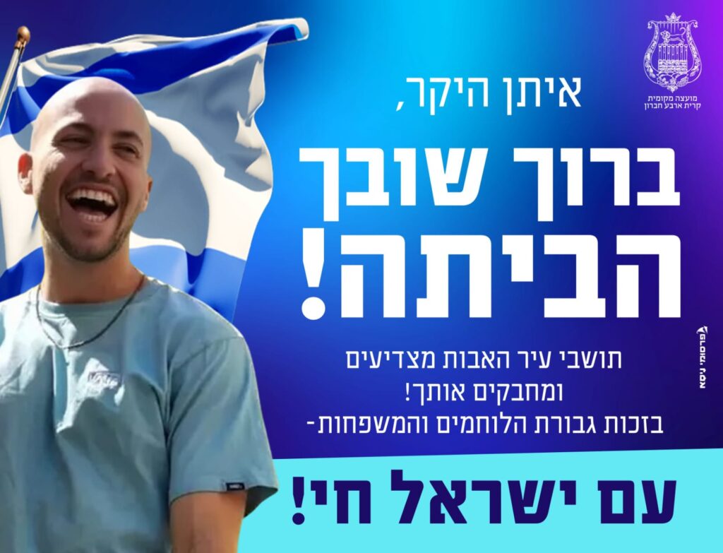 קהילת קרית ארבע חברון נרגשת עם חזרתו של איתן היקר, אשר שוחרר משבי חמאס ושב למשפחתו ולעיר האבות.