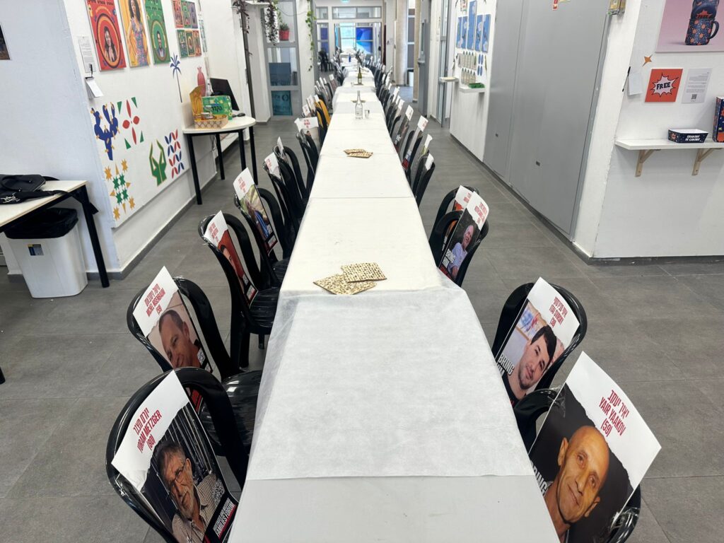 התלמידים והצוות ערכו בכניסה לבית ספר שולחן סדר עם מצות ויינות, כאשר לכל כסא הוצמדה תמונה של אחד/אחת מ-133 החטופים שנמצאים בשבי חמאס.
