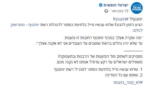 מנכ"ל התנועה אורי קידר בתגובה לשורת המהלכים של רשת יוחננוף בעניינה: "כשהמשפט הראשון שחשוב לרשת יוחננוף לכתוב בתביעה הוא שלא מדובר בתביעת השתקה, כל בר דעת מבין שזוהי בדיוק תביעת השתקה, שכל מטרתה לגרום לישראל חופשית להפסיק להלחם את מלחמתו הצודקת של יורי, שפוטר מעבודתו ביוחננוף לאחר שזכה ליחס מזלזל ומשפיל מהרשת. לצערנו רשת יוחננוף ממשיכה בהתנהלות בריונית, במקום לקחת אחריות על מעשיה הרעים ולתקנם. אנחנו נגיב בבית המשפט ונשמח לנהל הליך משפטי מלא, שבו נברר מה עשה כל אחד ואחד ממנהלי רשת יוחננוף בזמן שבו החברה בחרה לעמוד לצד משגיח הכשרות שהתנהג באופן גזעני ולא לצד עובדיה. אין לנו ספק שגם ציבור המשקיעים ביוחננוף בבורסה יגלו עניין רב בתביעה הזו. נתראה בבית המשפט".