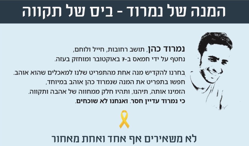 במסגרת היוזמה המיוחדת, עשרות מסעדות ובתי קפה ברחובות וברחבי הארץ מקדישים מנה אחת בתפריט לזכרו של נמרוד כהן, לוחם השריון מרחובות, שנחטף מטנקו על ידי מחבלי חמאס ומצוי בשבי בעזה מאז 7 באוקטובר.