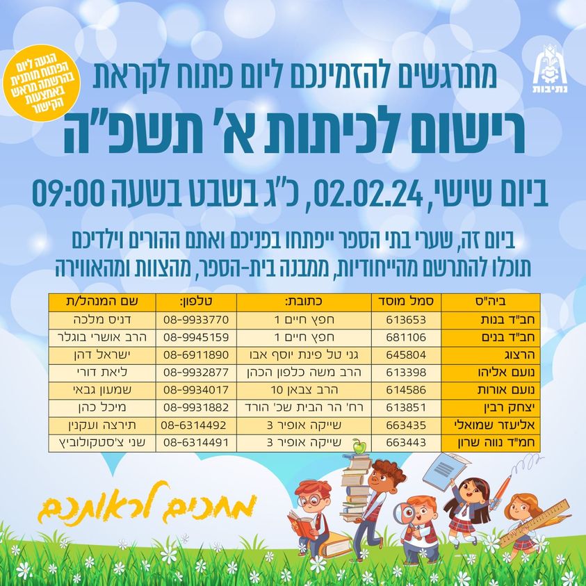 עיריית נתיבות הודיעה, כי היום הפתוח לקראת רישום הילדות והילדים לכיתות א' תשפ"ה נדחה בשל מזג האוויר.