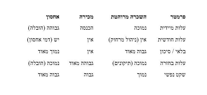 | פרמטר | השכרה מרוהטת | מכירה | אחסון |