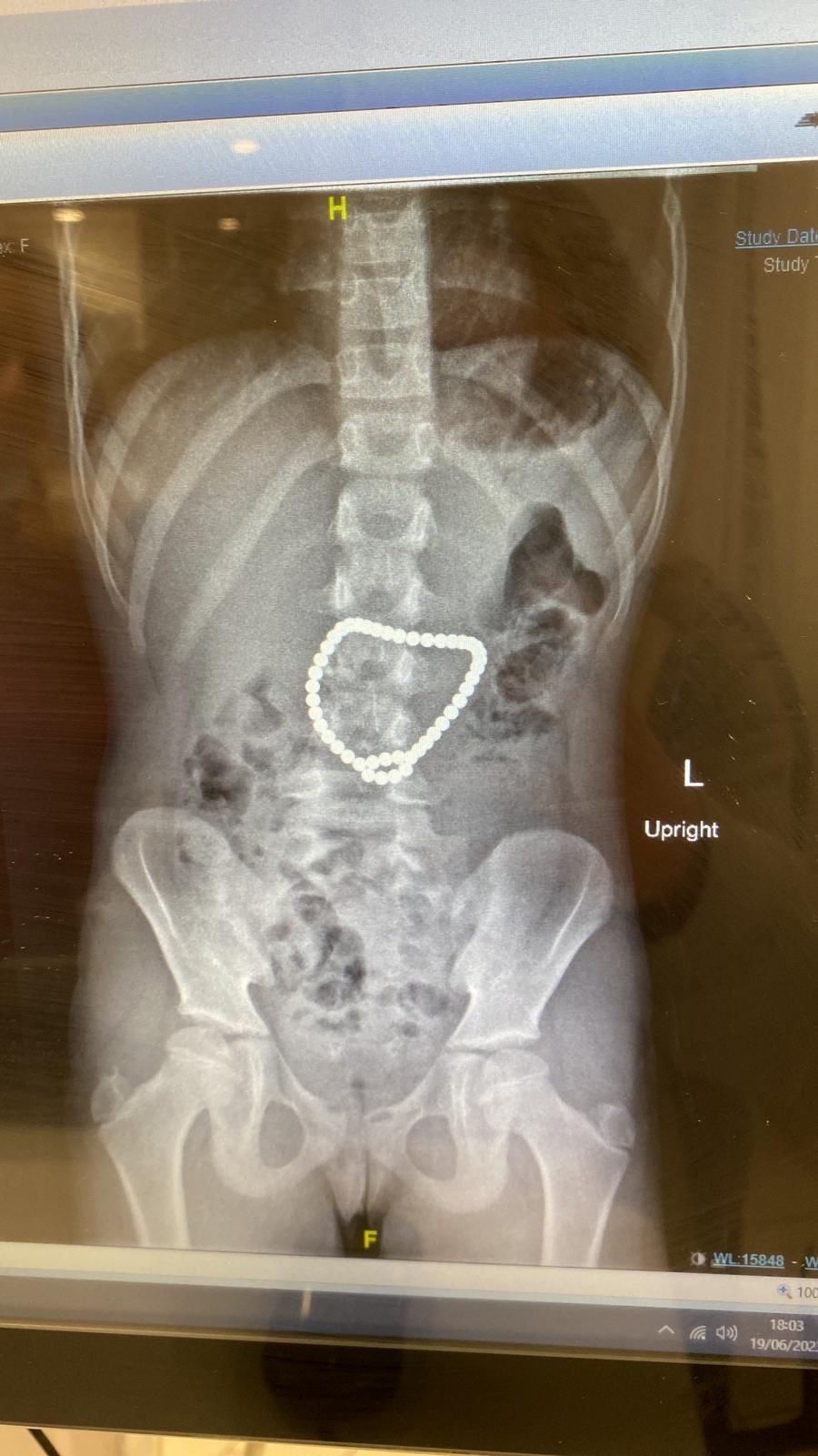 עם קבלתה במיון הילדים, חשדו הרופאים כי הילדה בלעה עצם זר, אך היא הכחישה זאת. אף על פי כן, מיהרו הרופאים לבצע צילום בטן. בצילום נמצאה שרשרת ארוכה ביותר מונחת במוצא הקיבה.