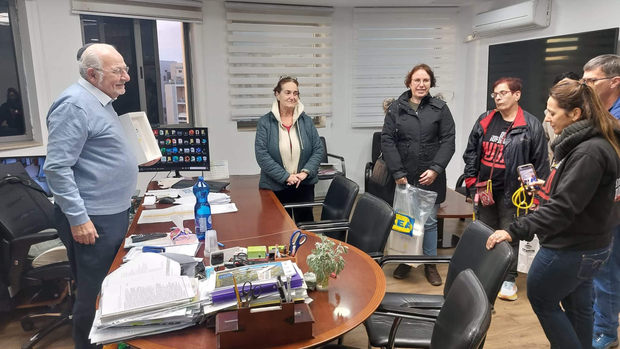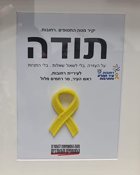 מעמד מרגש: נציגי מטה החטופים ברחובות הגיעו לבניין העירייה שם העניקו לראש העיר רחמים מלול, את תעודת יקיר המטה. התעודה ניתנה מטעם המשפחות כאות תודה על כך שלאורך החודשים האחרונים שמר מלול על נושא החטופים בראש סדר העדיפות.