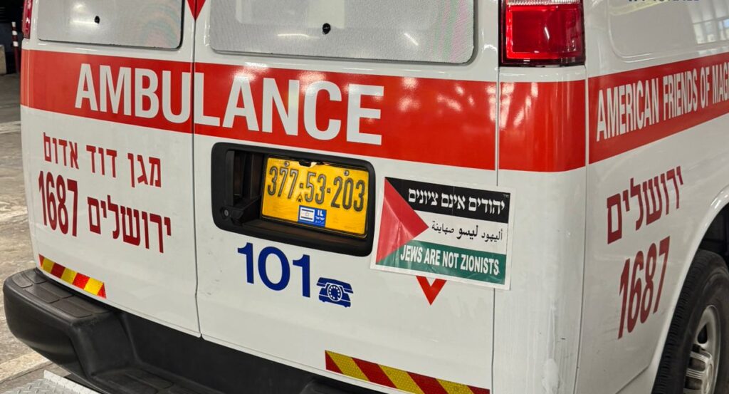אמבולנס של מגן דוד אדום שהגיע לטפל בחולה בשכונת מאה שערים בירושלים הושחת במהלך האירוע. בעת כניסת הצוות לבניין, הודבקה על האמבולנס מדבקה עם הכיתוב "יהודים אינם ציונים", ודגלי ישראל המוטבעים על האמבולנס רוססו בצבע.