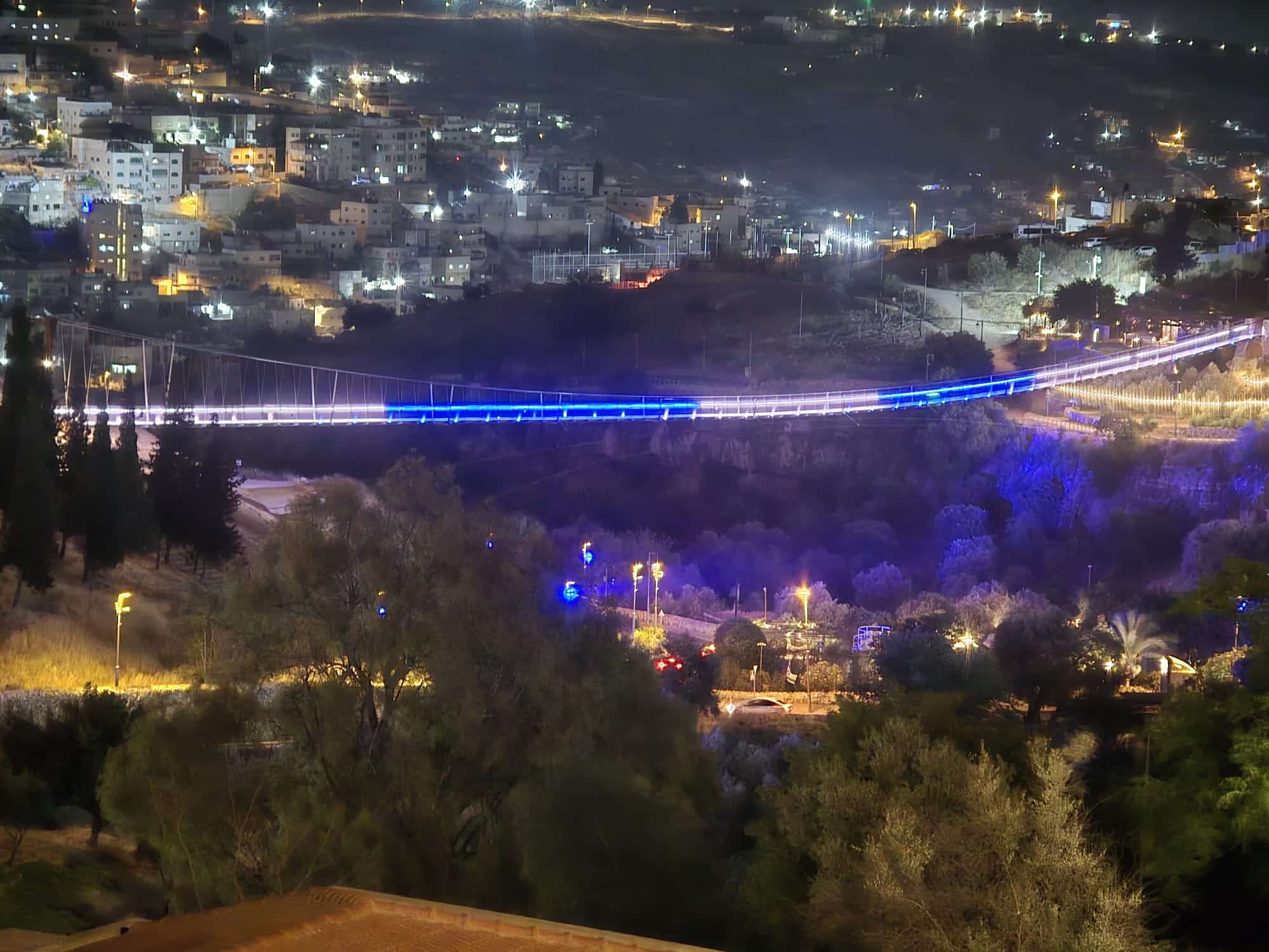 צילום: הארת הגשר התלוי בגיא בן הינום בצבעים כחול ולבן קרדיט: מתנאל רחמים | הקרנה על גשר המיתרים. קרדיט סרטונים ותמונות: ארנון בוסאני