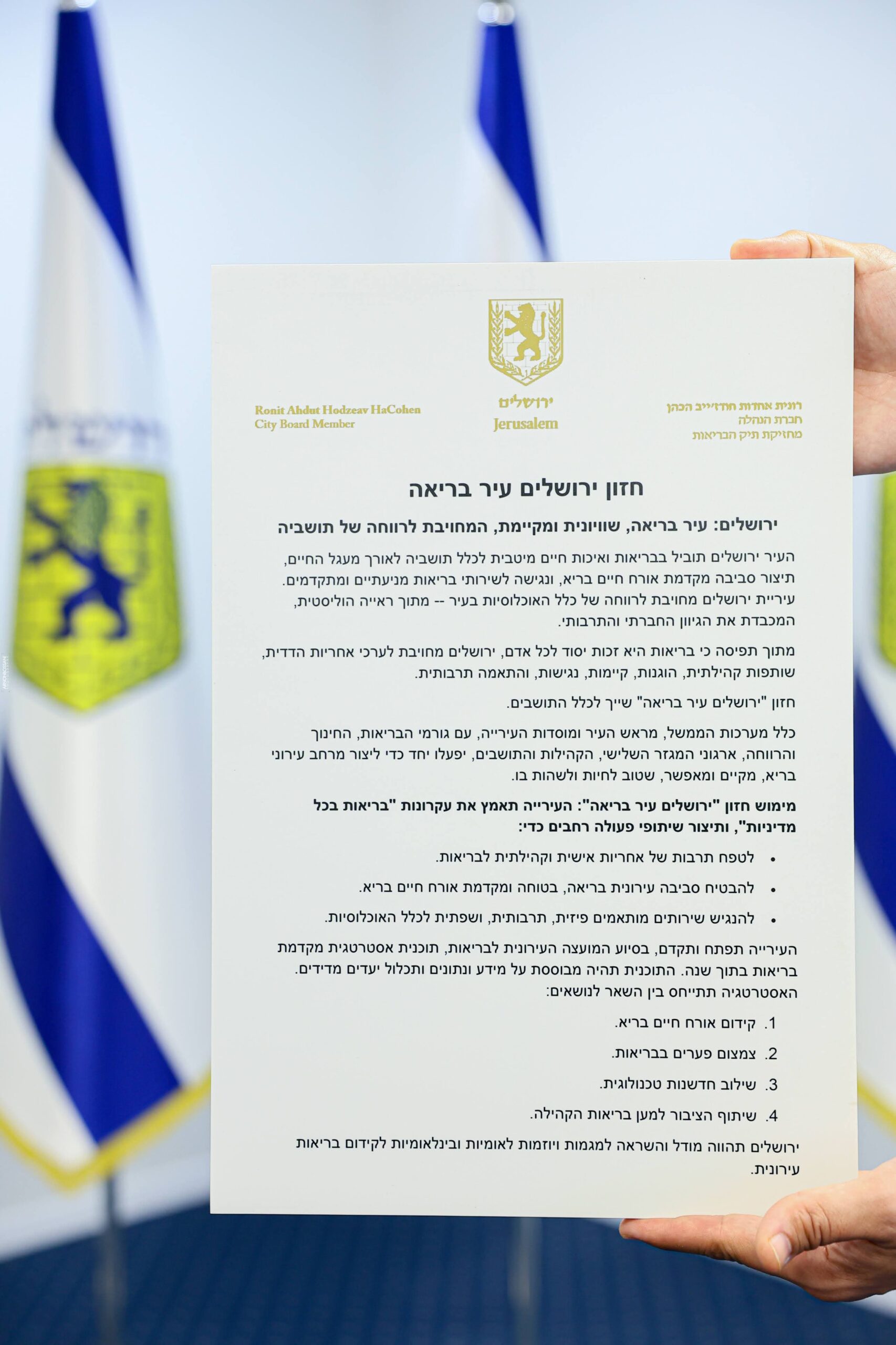 עיריית ירושלים משיקה חזון עירוני מקיף ומהפכני: "ירושלים – עיר בריאה, שוויונית ומקיימת", ביוזמתה של ד"ר רונית אחדות חודז'ייב הכהן, חברת מועצת העיר ויו"ר המועצה העירונית לבריאות הציבור, ובתמיכתו ועידודו של ראש העיר, משה ליאון