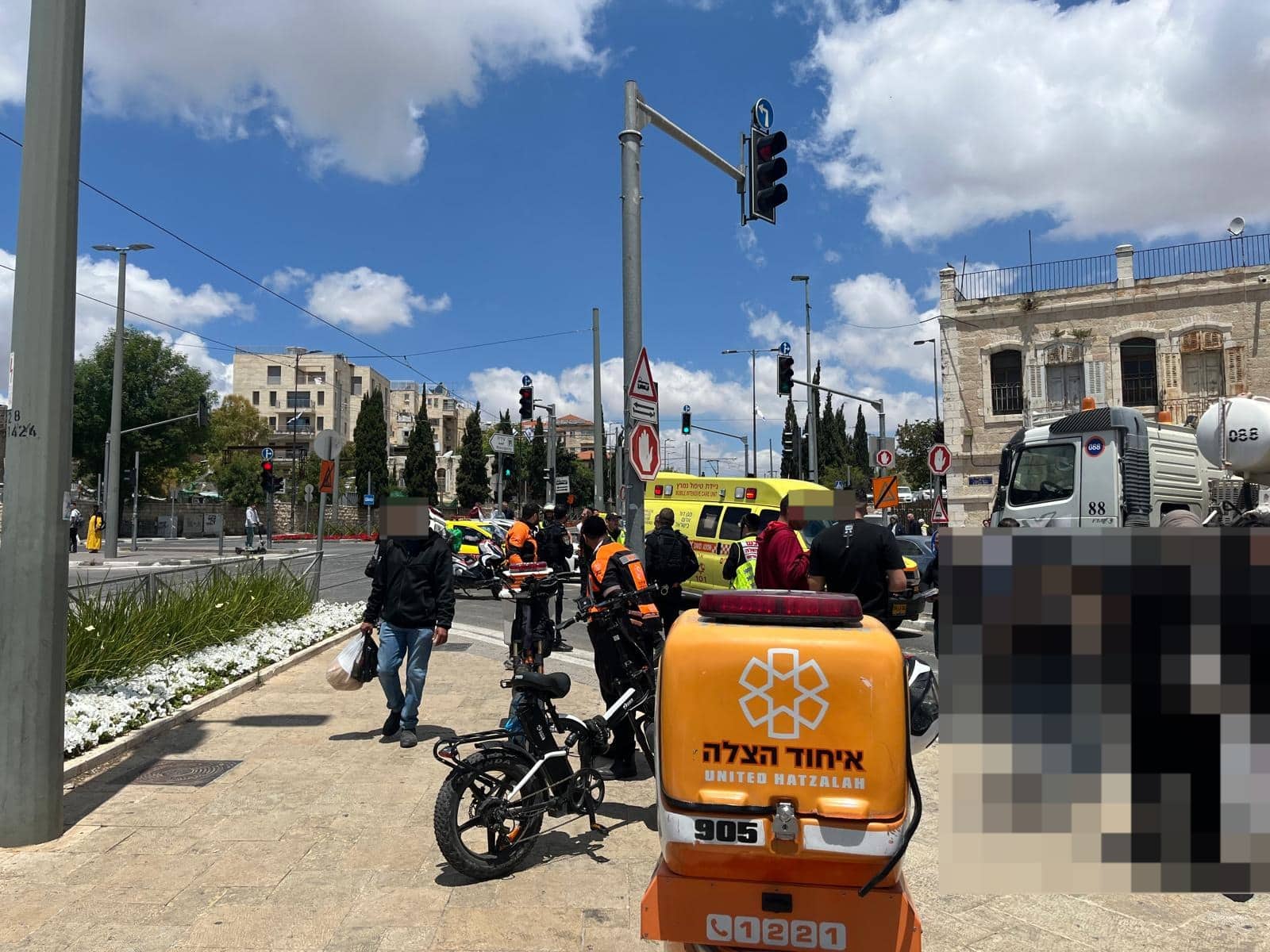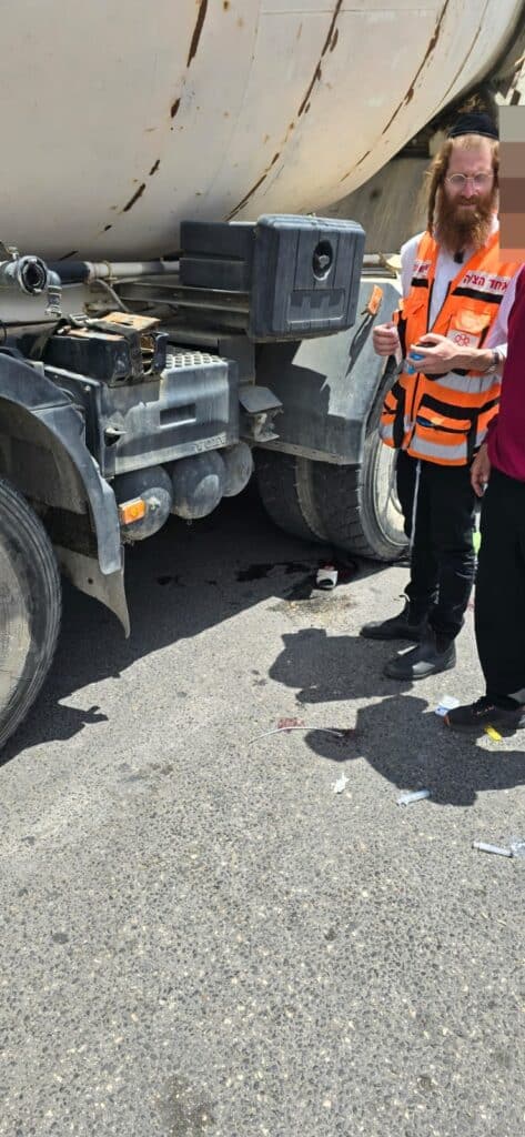 "הענקנו סיוע רפואי בזירה להולכת הרגל שסובלת מחבלות ופציעות קשות כתוצאה מפגיעת מערבל בטון. לאחר הסיוע הראשוני היא פונתה לבית חולים במצב קשה".