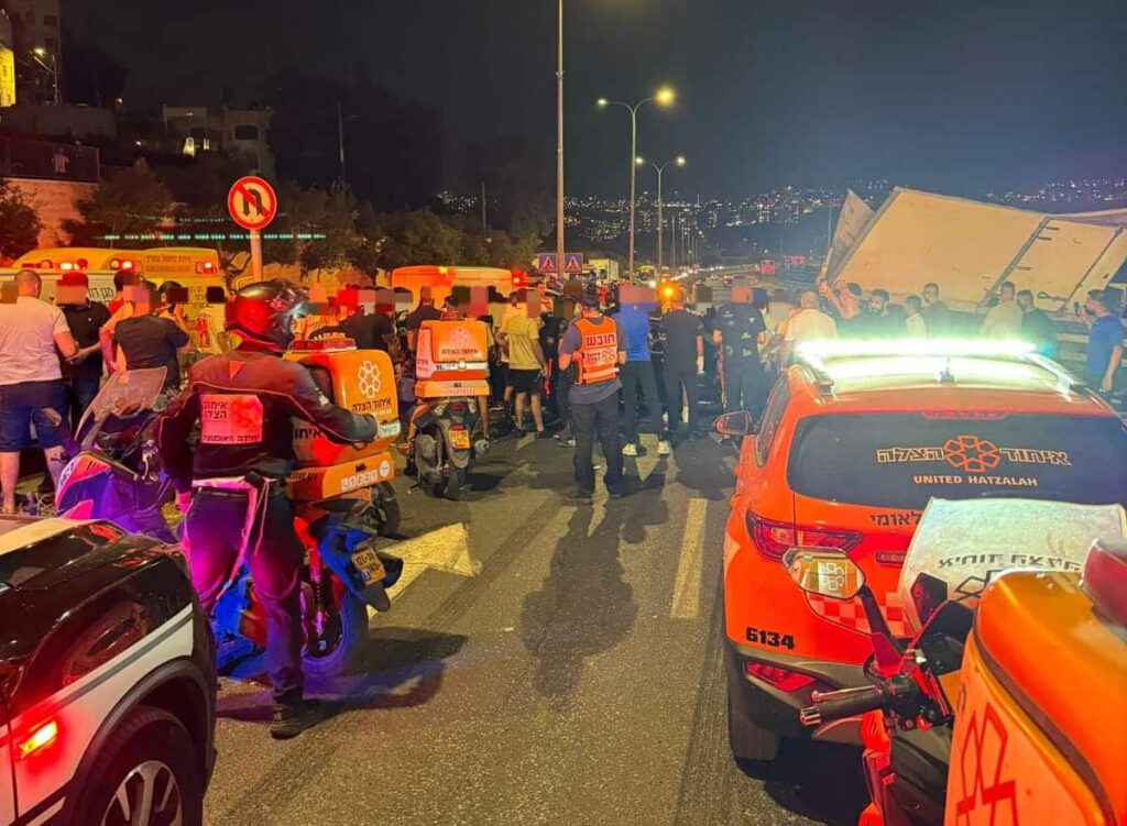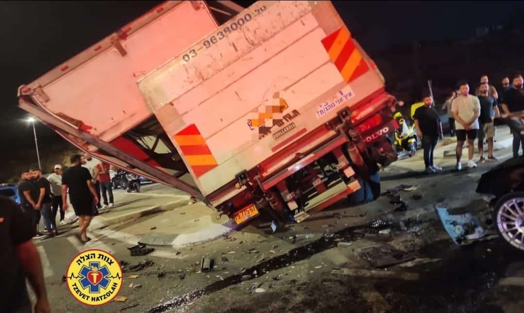 "מדובר בתאונה עם מעורבות משאית ורכב פרטי. הענקנו סיוע רפואי בזירת התאונה לשני נפגעים (בגילאי ה25) נוסעי הרכב שנפצעו באורח בינוני. כמו כן הענקנו סיוע רפואי לנהג המשאית שנפצע באורח קל עד בינוני ופונה בנידת טיפול נמרץ של איחוד הצלה לבית החולים הדסה עין כרם להמשך טיפול."