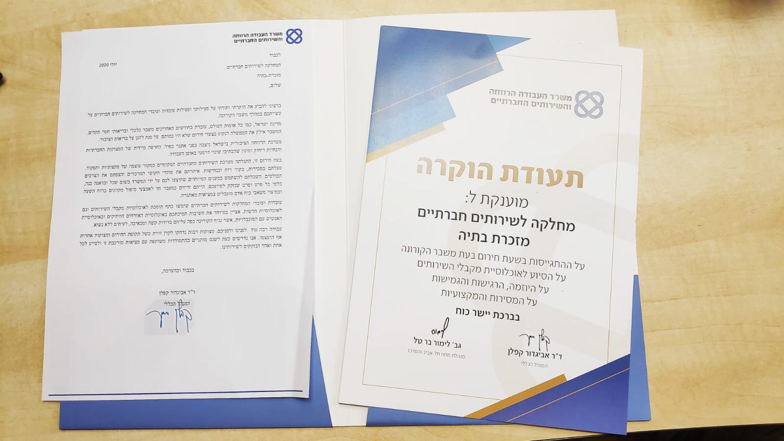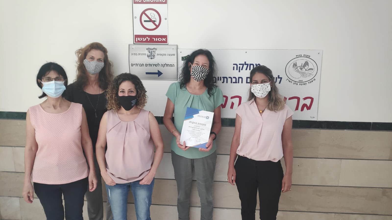 בעיצומו של נגיף הקורונה, נרשם היום שיא נוסף במזכרת בתיה כאשר קרן אהרוני, מנהלת נפת דרום במחוז ת״א והמרכז של משרד העבודה והרווחה, הגיעה למושבה והעניקה באופן אישי, תעודת הוקרה ממנכ״ל המשרד, לעובדות המחלקה לשירותים חברתיים, על ההתגייסות, העשייה, היוזמה, הרגישות, הגמישות, המסירות והמקצועיות שמאפיינת אותם בכל יום ובמיוחד בשעות חירום כדוגמת משבר הקורונה.