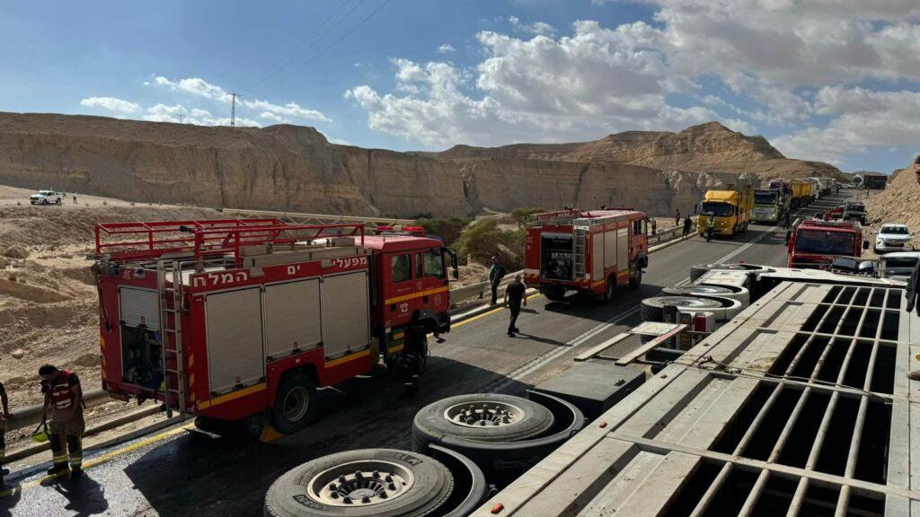 כמו כן, הצוותים פועלים לטיפול בשפך של שמן וסולר אשר דולפים מן המשאית כתוצאה מהתאונה.