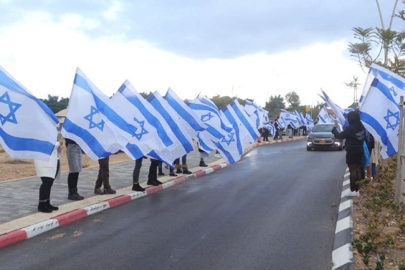 מאות עמדו לצידי הדרך המובילה לבית העלמין הצבאי, כשהם מניפים את דגלי ישראל לאות כבוד והצדעה.
