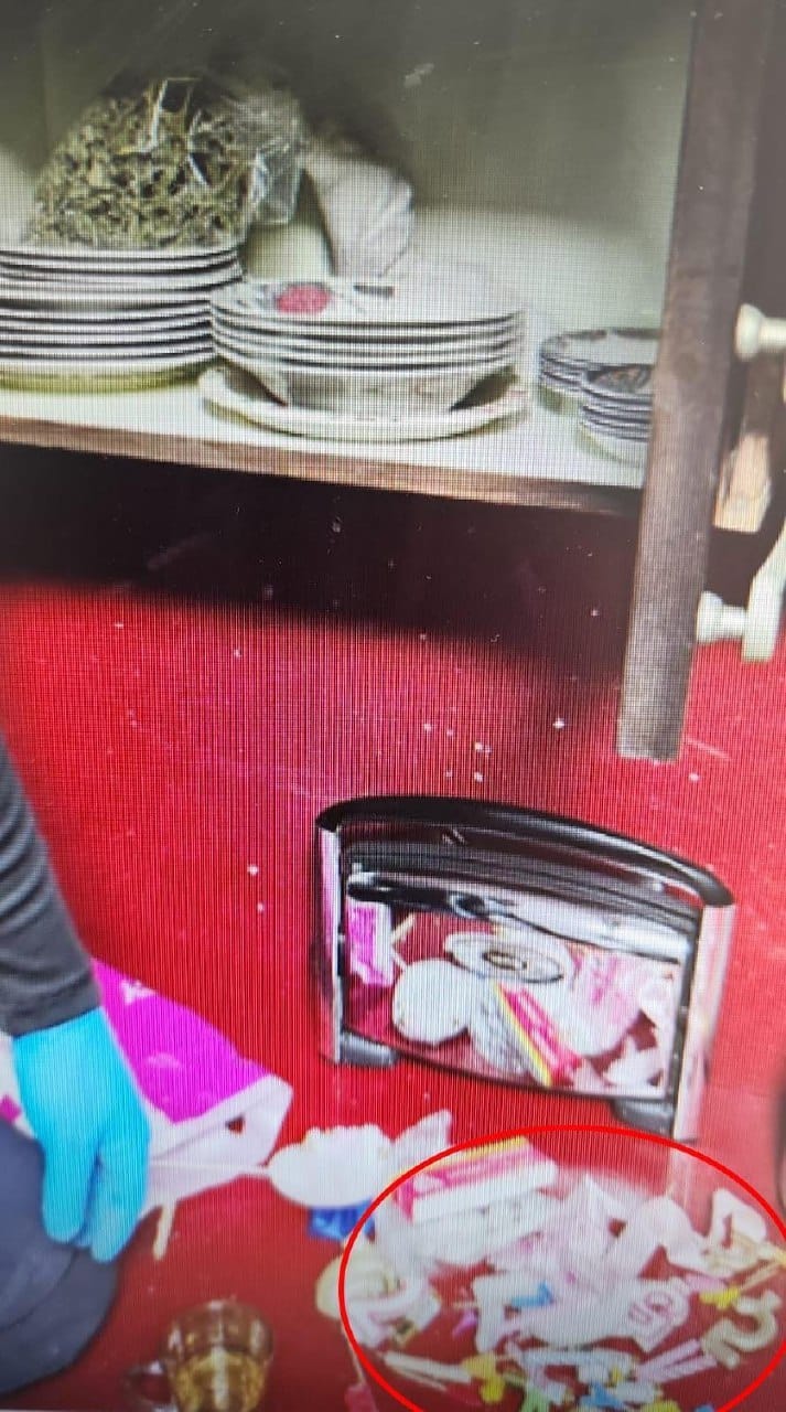 אחד האקדחים נתפס כשהוא מוסלק בארון בין נרות יום הולדת צבעוניים. אקדח נוסף, נמצא מוסלק במתחם הבית. בנוסף, בלשי המשטרה תפסו כ-150 כדורי אקדח, אף הם מוסלקים.