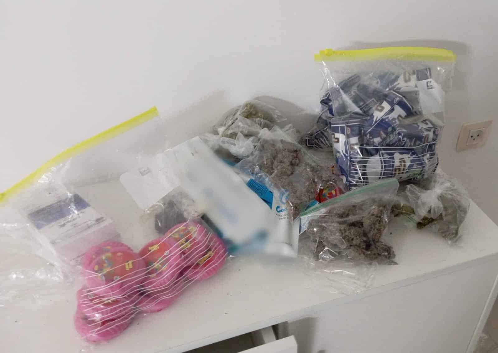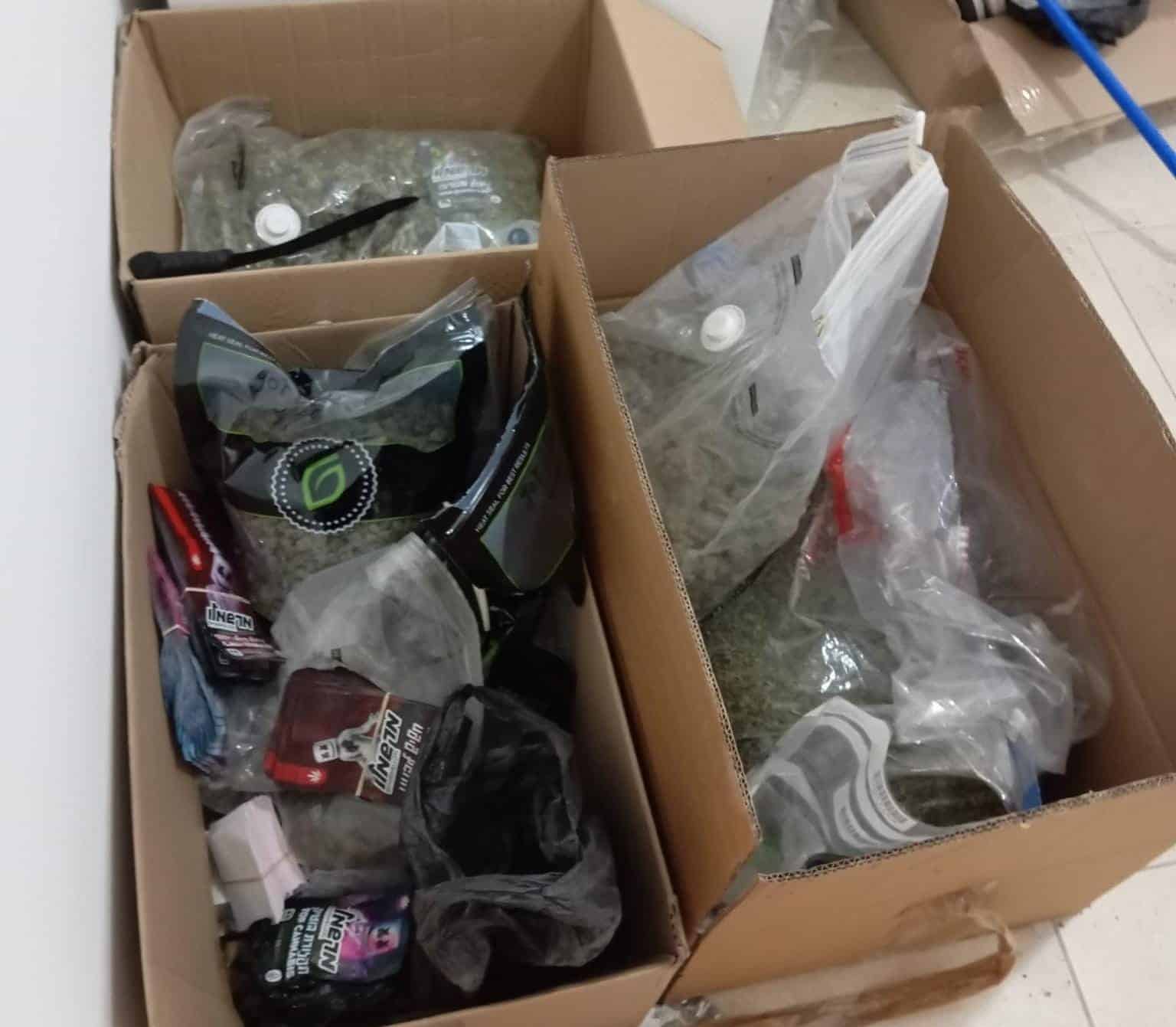 במהלך החיפוש תפסו השוטרים מגוון רחב של חומרים החשודים כסמים מסוגים שונים עפ"י הפירוט: 24.484 ק"ג קנאביס, 1.102 ק"ג חשיש, 52 סיגריות אלקטרוניות עם חומר החשוד כסם, 11 חבילות של עוגיות קנאביס, 13 חבילות מסטיקים עם קנאביס, 5 יזרקים של שמן קנאביס, משחת קנאביס, קופסא עם חומר גבישי לבן. בנוסף, נתפסו מכונה לספירת שטרות ומשקל מסחרי.