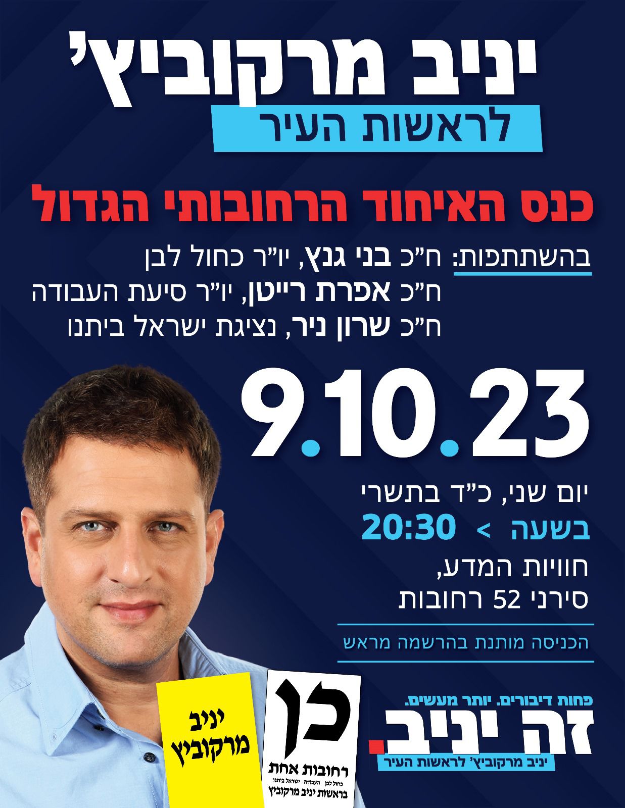 המועמד לראשות העיר, יניב מרקוביץ', וראש רשימת 'רחובות אחת', יקיים ברחובות ביום שני הקרוב, ה-9/10, אירוע איחוד גדול בו יתארחו למפגן תמיכה ענק כל נציגי המפלגות הארציות שהתאחדו: יו"ר כחול לבן, ח"כ בני גנץ, יו"ר סיעת העבודה, ח"כ אפרת רייטן וח"כ שרון ניר, נציגת "ישראל ביתנו".