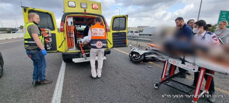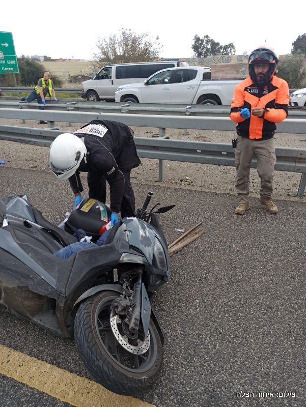 לפי זמן קצר (חמישי), התקבל דיווח במוקד 101 של מד"א במרחב איילון על תאונת דרכים בין שני אופנועים ומשאית בכביש 4 סמוך למחלף יבנה לכיוון צפון. חובשים ופראמדיקים של מד"א מעניקים טיפול רפואי ומפנים רוכב אופנוע כבן 40 במצב בינוני עם חבלות בגפיים לבי"ח קפלן ורוכב נוסף במצב קל לבי"ח אסותא.