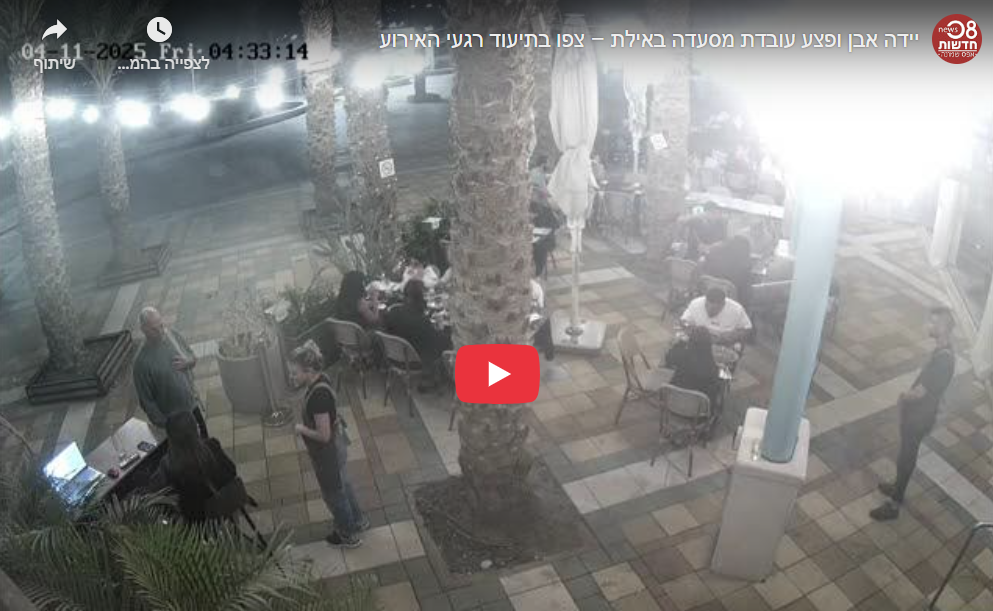 כתב אישום ובקשת מעצר עד תום ההליכים יוגשו נגד דר רחוב שיידה אבן ופצע עובדת מסעדה באילת – צפו בתיעוד רגעי האירוע ביום 11.4.25 פתחה משטרת מרחב אילת בחקירה עם קבלת דיווח על תקיפתה של עובדת באחת ממסעדות העיר אילת.
