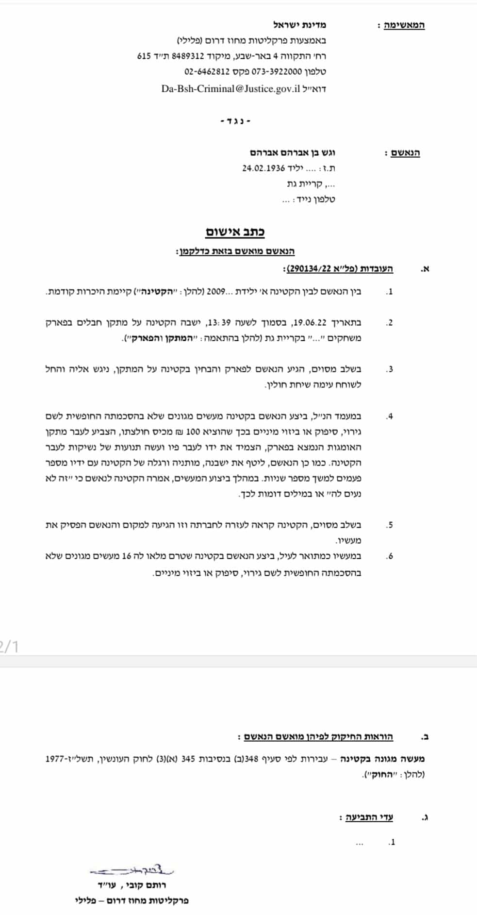 פרקליטות המדינה הגישה לבית המשפט השלום באשקלון כתב אישום נגד וגש אברהם (87) מקרית גת לאחר שביצע מעשה מגונה בקטינה בגן שעשועים בעיר.