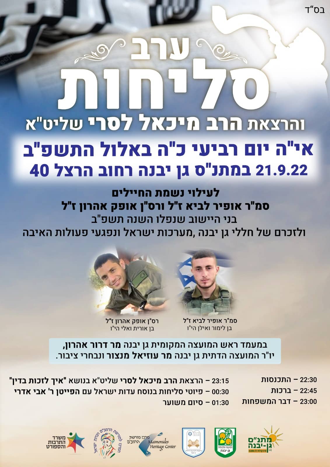 באופן מצמרר, הערב (רביעי, 21.9) יתקיים ערב סליחות במתנס גן יבנה (רח' הרצל 40) עם הרב מיכאל לסרי שליט״א החל מהשעה 22:30 לזכרם של סמ"ר אופיר לביא ורס"ן אופק אהרון – בני היישוב שנפלו השנה ולזכרם של חללי גן יבנה, מערכות ישראל ונפגעי פעולות האיבה. האירוע במעמד ראש המועצה מר דרור אהרון, יו"ר המועצה הדתית מר עוזיאל מנצור ונבחרי ציבור. הציבור מוזמן.