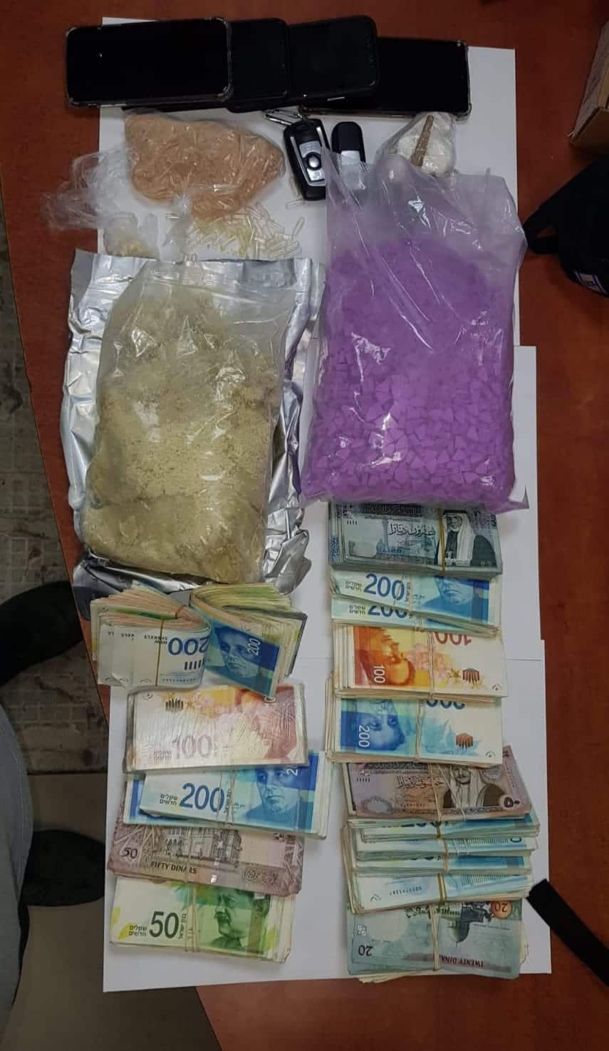 בחיפוש בביתו נתפסו כ-10,000 כדורי אקסטזי במשקל כולל של כ-2 ק"ג, 1.25 ק"ג קאטמין ו-145 גר' MD. בנוסף נתפס כסף מזומן בסך 175 אלף ש"ח, 7 טלפונים סלולריים, שני משקלים דיגיטליים ושני מכשירי הקלטה. כמו כן, נתפסו רכב וקטנוע יקרי ערך, אותם תבקש המשטרה לחלט בהמשך. שני החשודים, בעל הדירה ואישתו (35 ,36 רמלה), נעצרו לחקירה והיום תבקש המשטרה להאריך את מעצרם בבית המשפט.