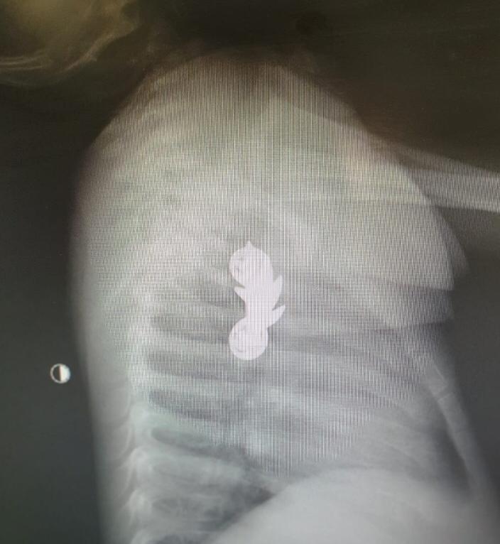 המציאות במקרה זה עלתה על כל דמיון – בצילום נצפה חפץ שזוהה כסיכת מ"מ צה"לית. עקב גודלו וצורתו החריגים של הגוף הזר הוזעק צוות משולב של מומחי גסטרו ילדים, אף אוזן גרון וטיפול נמרץ ילדים לבית החולים והתינוק הוכנס מידית לחדר הניתוח.