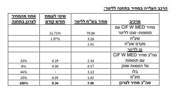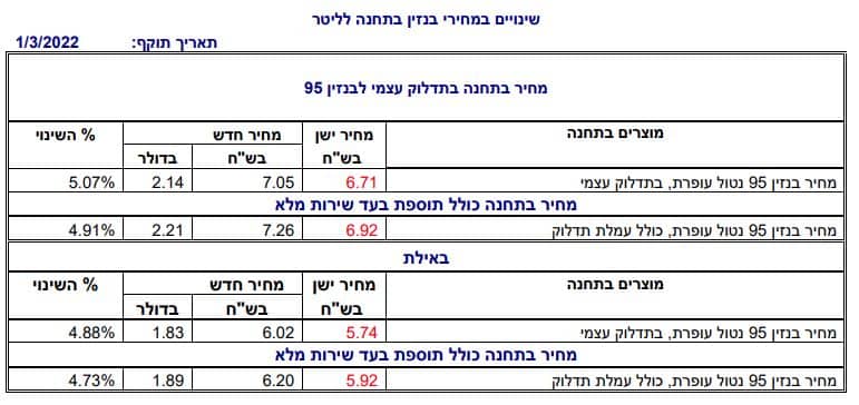 המחיר המרבי לליטר בנזין 95 אוקטן נטול עופרת לצרכן בתחנה בשירות עצמי (כולל מע"מ) לא יעלה על 7.05 ש"ח לליטר, עלייה של 34 אגורות מחודש קודם. תוספת בעד שירות מלא תעמוד על 21 אגורות לליטר (כולל מע"מ), ללא שינוי מחודש קודם. המחיר המרבי לליטר בנזין 95 אוקטן נטול עופרת לצרכן בתחנה בשירות עצמי באילת (ללא מע"מ) לא יעלה על 6.02 ש"ח לליטר, עליה של 28 אגורות מחודש קודם. תוספת בעד שירות מלא תעמוד על 18 אגורות (ללא מע"מ), ללא שינוי מחודש קודם. משרד האנרגיה ממליץ להשוות מחירים ולבחור בתחנה הכדאית ביותר לצרכן.