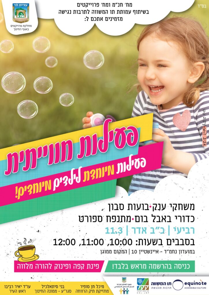 עיריית לוד מזמינה את הילדים המיוחדים בעיר להשתתף בשעת פעילות הפגתית מיוחדת, שתיערך מחר (רביעי), במועדון "נחמד" ברחוב אינשטיין 10, בשעות הבוקר.