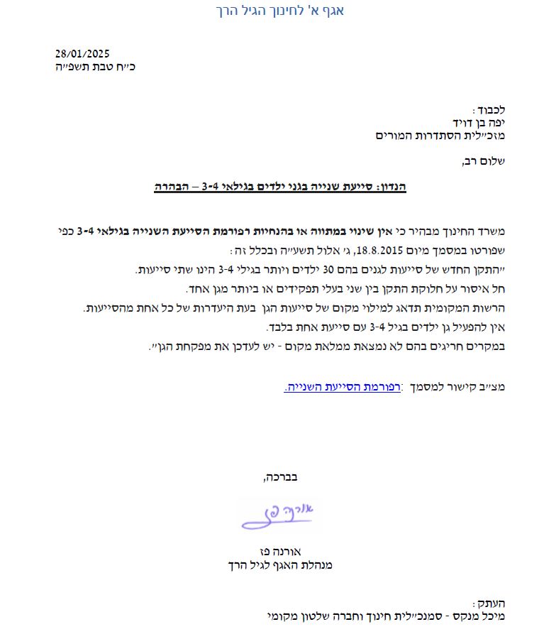משרד החינוך פרסם הבוקר [רביעי] הבהרה לגבי הנחיות בנושא רפורמת הסייעת השניה וחידד את התקן לפיו ניתן לפתוח גן עם 30 ילדים ומעלה בגילאי 3-4 רק בתנאי שיש שתי סייעות וגננת.