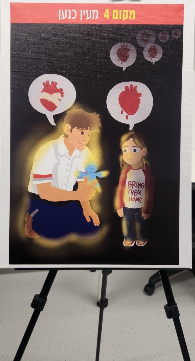 "בשנתיים האחרונות מדינת ישראל חוותה תקופה קשה מבחינה נפשית ולאומית – דאגה לחטופים, ספגה המון כאב ואובדן וזעקה שהמלחמה הזאת תפסיק. רבים מאיתנו חשו חוסר ודאות וייאוש, ולפעמים היה נדמה שאין תקווה. דווקא בתוך החושך הזה, אנשי מגן דוד אדום באו לעזור. להאיר את מה שאחרים לא רואים. הם שם תמיד, ליד מי שצריך, מרפאים לא רק את הגוף, אלא גם את הלב הפועם של המדינה", הסבירה מעין והוסיפה על היצירה, "ביצירה שלי בחרתי להראות את מד"א כקרן אור בחשכה, את האכפתיות, החמלה והתקווה שהם מביאים אפילו ברגעים הקשים ביותר. הילדה שבציור מייצגת את הכאב הלאומי, את הציפייה להשיב את החטופים הביתה, והמתנדב שמולה – את התקווה, את הריפוי, ואת האמונה שיחד נצליח להחזיר אור ושלום לחיינו".