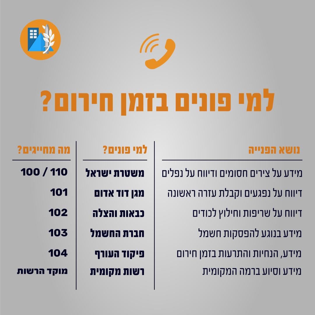 • 102 – כבאות והצלה: דיווח על שריפות וחילוץ לכודים.