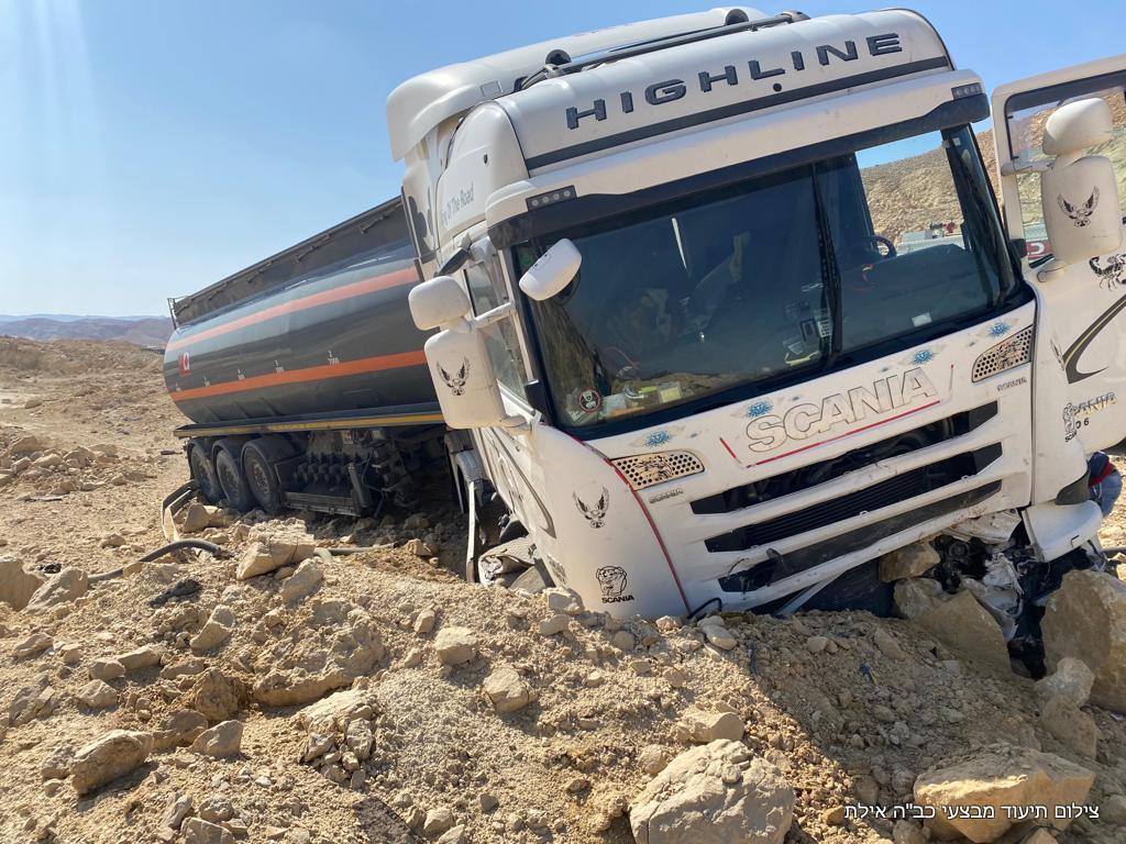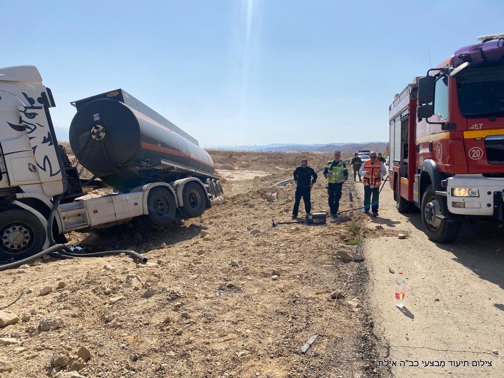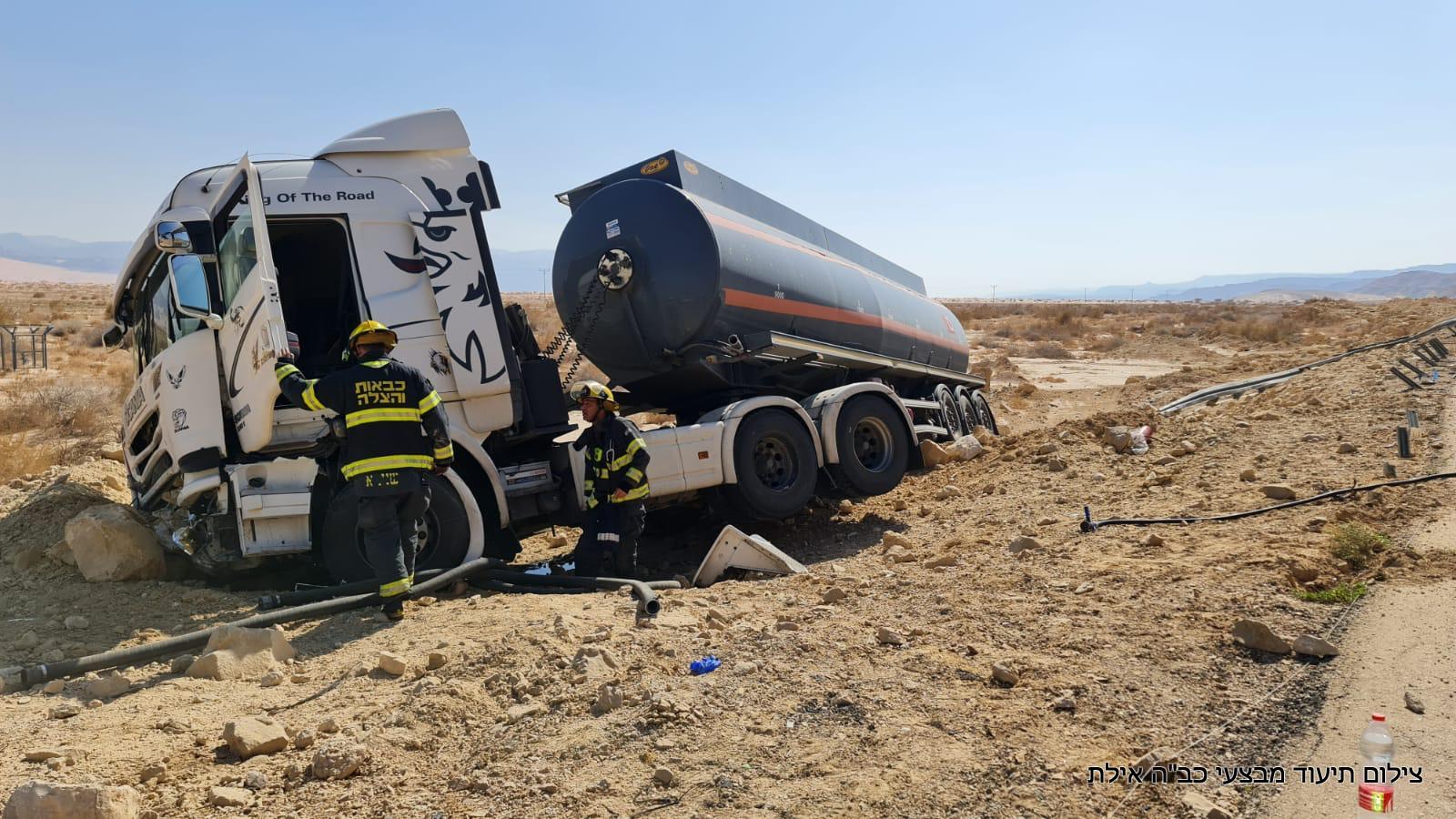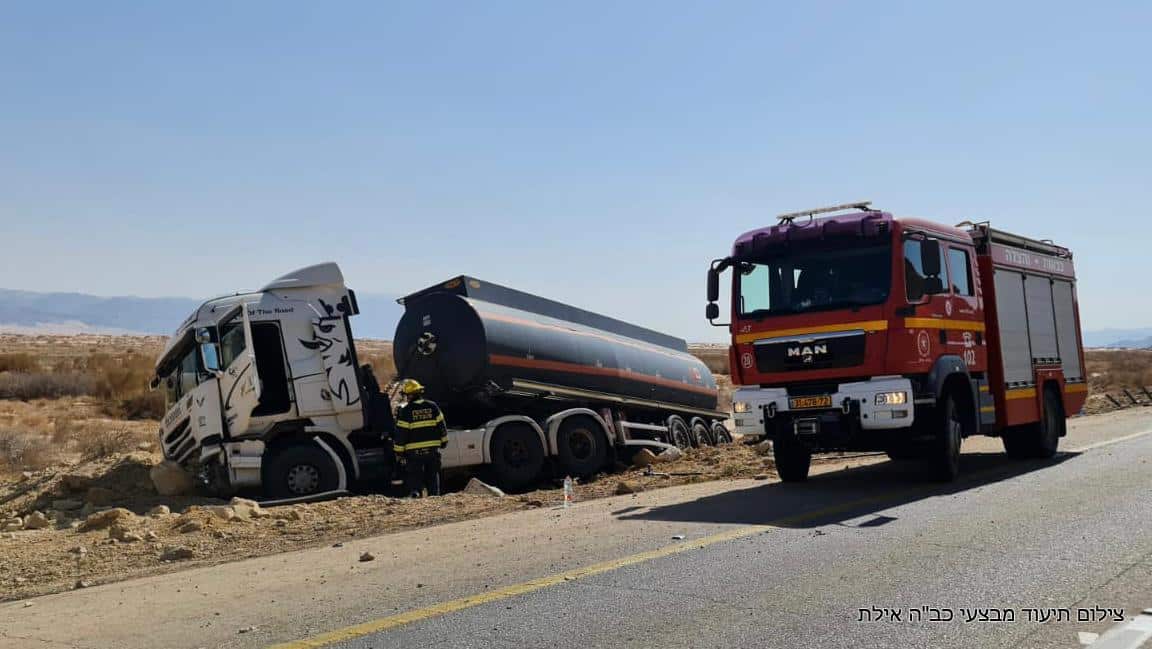 לפני זמן קצר (רביעי) התקבלה הודעה במוקד 102 של מחוז דרום על תאונת דרכים שבה מעורבת מיכלית סולר בק״מ 75 על כביש הערבה. צוותי כיבוי וחילוץ מתחנות יוטבתה ותמנע שהגיעו למקום, הבחינו במשאית שסטתה מהכביש וכתוצאה מכך החלה דליפת סולר. הלוחמים פעלו לטיפול בשפך של החומר שדלף ולשלילת סכנת התלקחות במקום. נהג המשאית נפגע באורח קל ולא דווח על נפגעים או נזק נוסף.