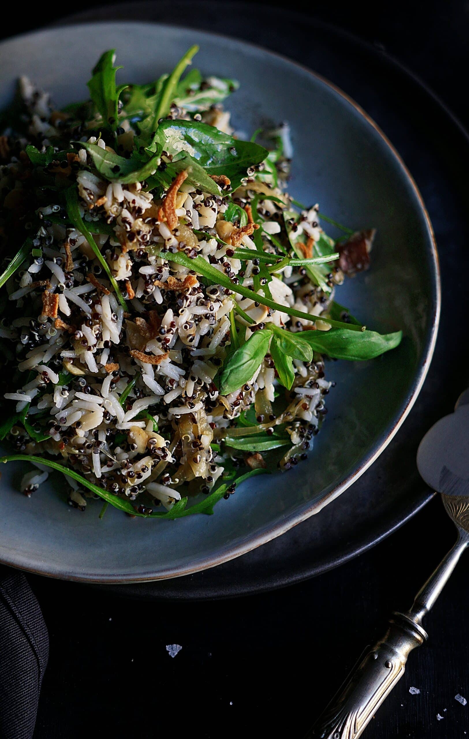 מרתיחים את הקינואה השחורה ואת האורז הבסמטי בסירים נפרדים ומוסיפים מלח. לאחר ששניהם מוכנים, מצננים אותם במהירות במים קרים ושומרים אותם בצד למועד מאוחר יותר.