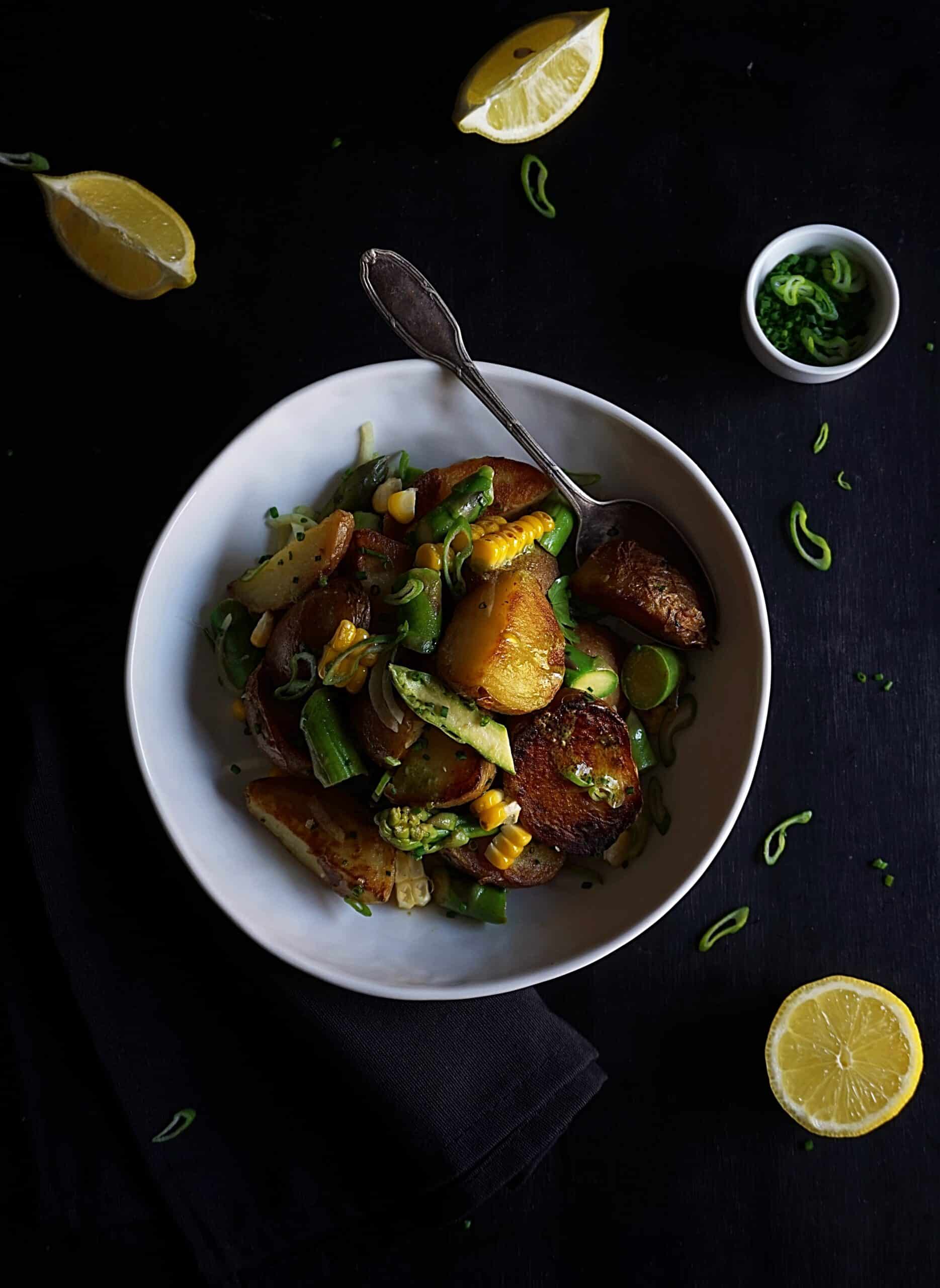 חותכים את הבצל האביבי לרצועות, לוקחים את גרעיני התירס ומוסיפים לצלחת תפוחי האדמה.