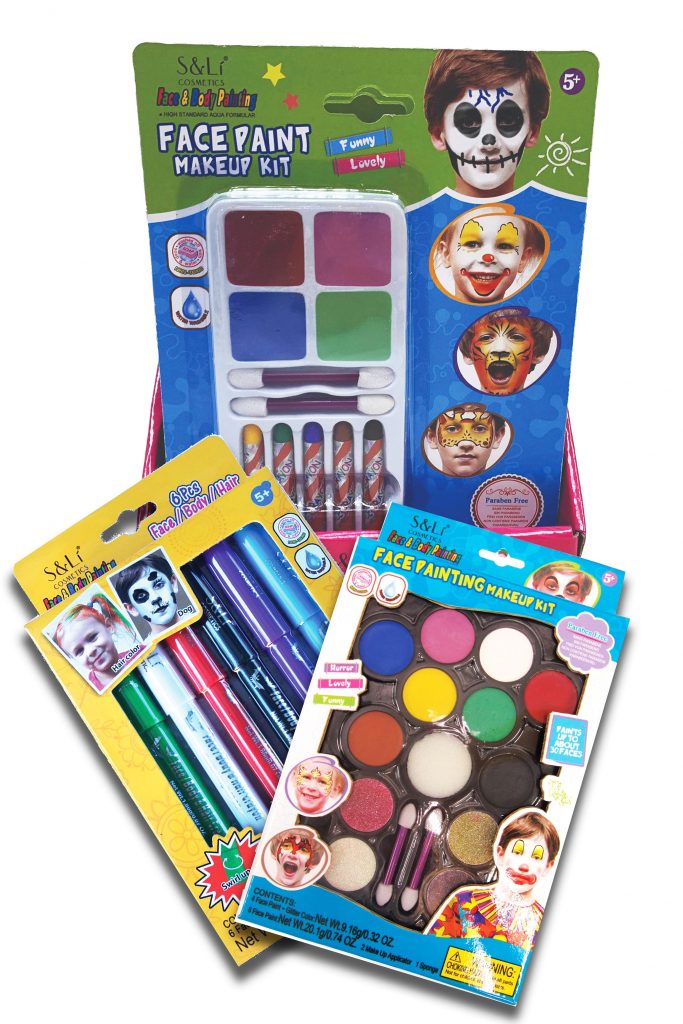 מארזי איפור לפנים המאגדים 8 גווני צבעים במרקם קרמי לצד שבלונות וספוגית אשר ניתן להתביע עמן מעין חותמות. מחיר: 17 שקל בפארמים ובחנויות ההפנינג ברחבי הארץ. על גבי האריזות מופיעות דמויות מאופרות כהמלצה ודוגמאות. הערכות מותאמות לאיפור ילדים. המוצרים נטולי פארבנים, אינם רעילים והם ניתנים לשטיפה במים וסבון. הערכות אינן מיועדות לשימוש מתחת לגיל 3.