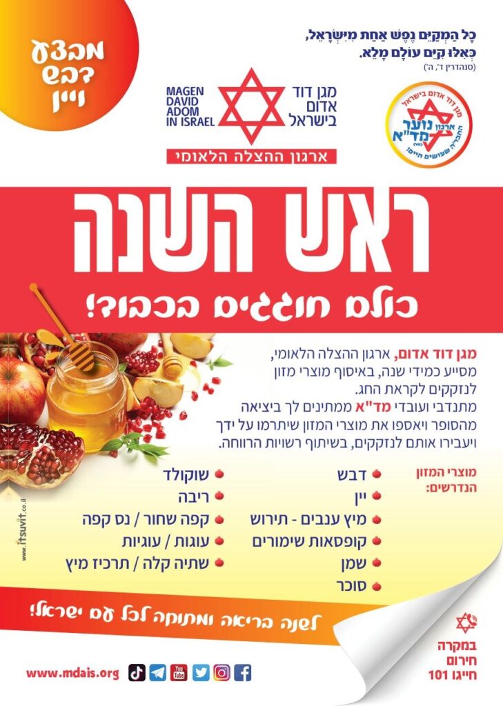 בימים אלו אלפי מתנדבי מד"א, בני נוער ובוגרים, פרוסים ברשתות השיווק ובמרכולים ברחבי הארץ במסגרת מבצע 'יין ודבש' לאיסוף חבילות מזון למשפחות מעוטות יכולת לקראת ראש השנה.