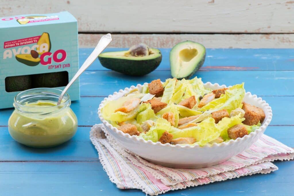 סלט קיסר עם רוטב אבוקדו וקרוטונים