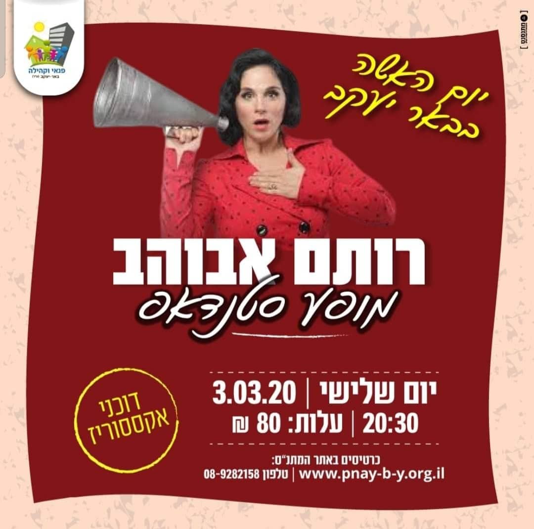 תאגיד לפנאי וקהילה בבאר יעקב מתכנן אירוע גדול לכבוד יום האישה בו תתארח רותם אבוהב למופע בידורי שיתקיים בתאריך ה-3.03.20, שעה 20:30 בעלות של 80 ש"ח, הכניסה לנשים בלבד.