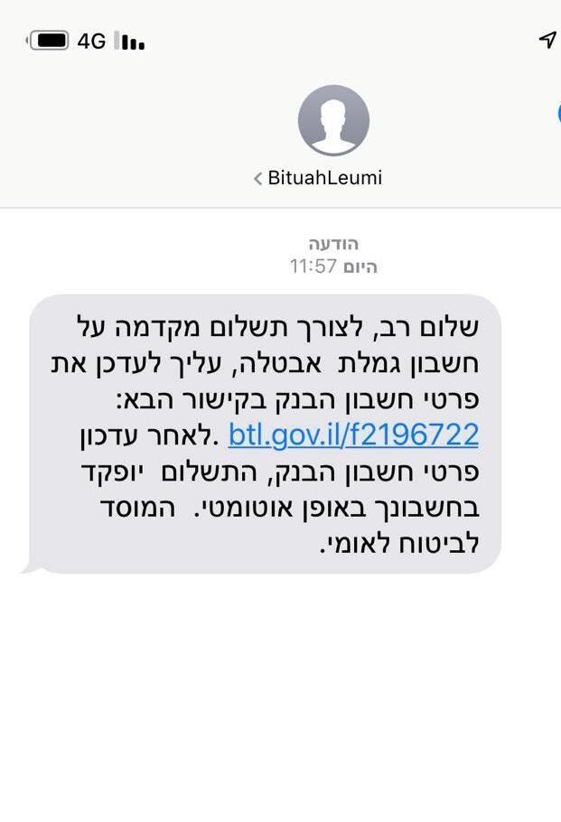 ההודעה של המוסד שמבהירה כי הודעת הטקסט הספציפית היא מהמוסד לביטוח לאומי: