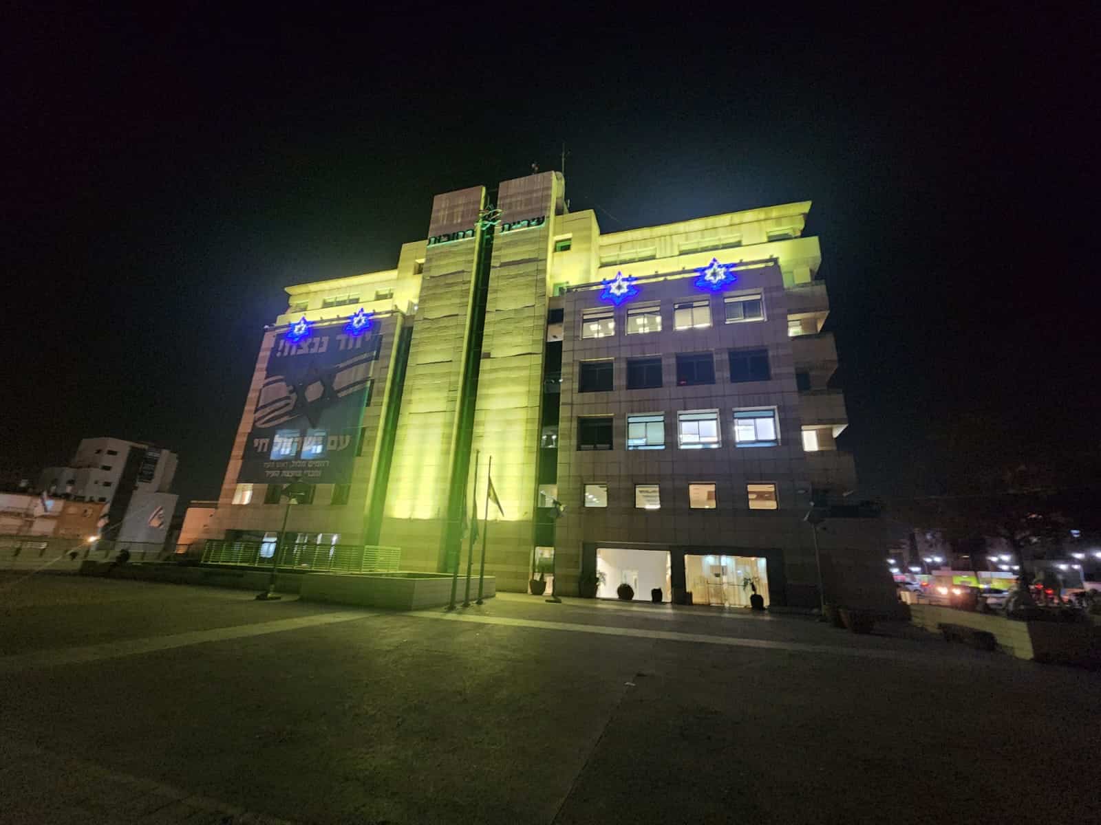 גם בניין עיריית רחובות הואר היום בצבע הצהוב, צבע המוזהה עם מאבק המשפחות להחזרת יקיריהם הביתה.