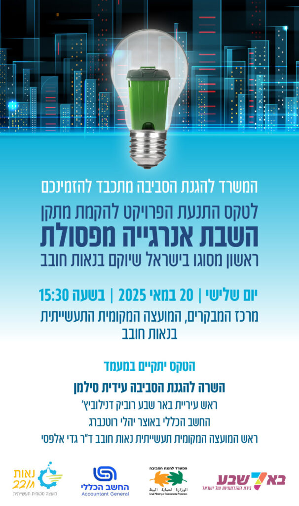 המשרד להגנת הסביבה, אגף החשב הכללי במשרד האוצר ועיריית באר שבע מזמינים אתכם לסיקור התנעת הפרויקט הסביבתי להקמת מתקן השבת אנרגיה מפסולת, ראשון מסוגו בישראל, אשר יוקם בנאות חובב
