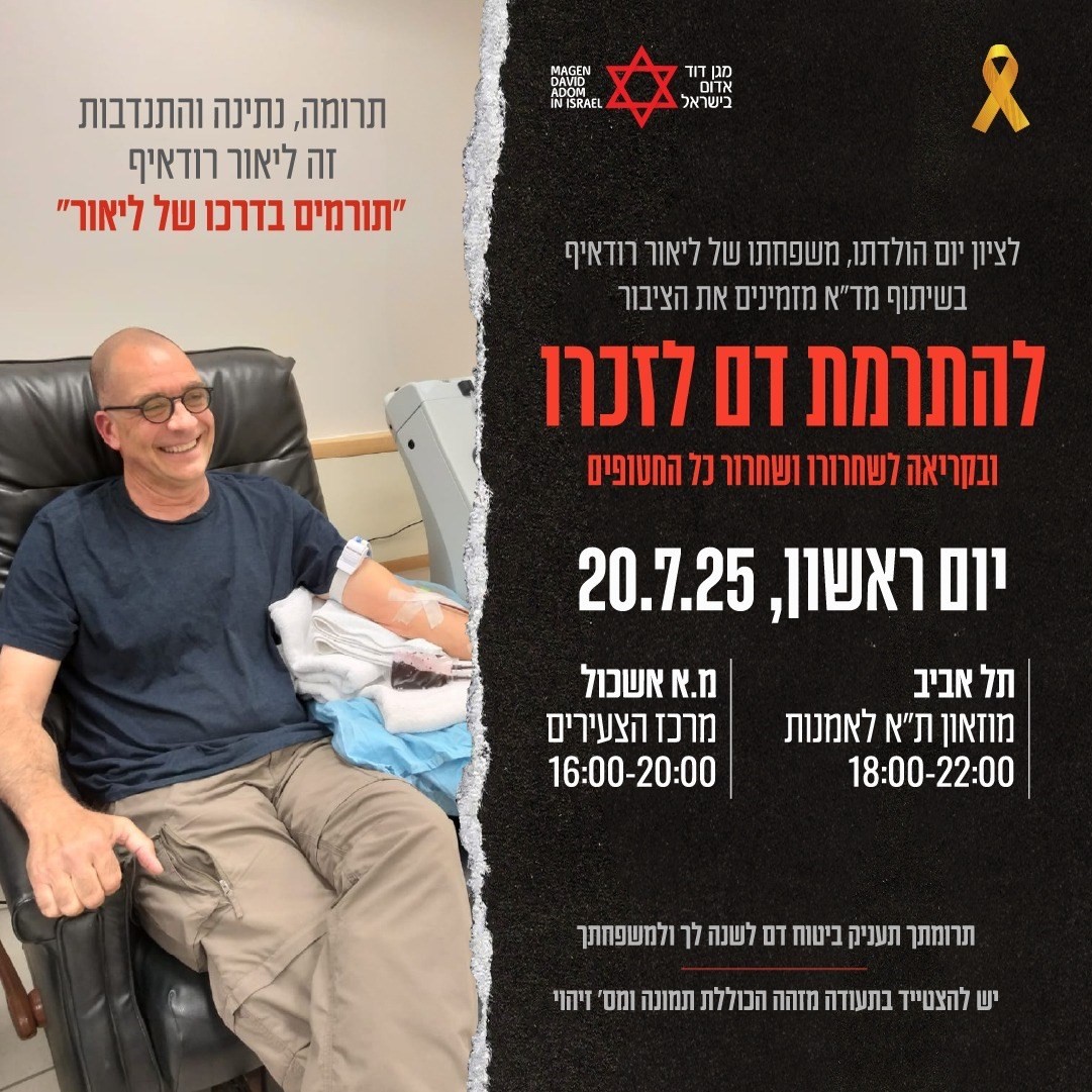 ביום ראשון הקרוב, 20 ביולי, יתקיים מבצע התרמת דם מיוחד לזכרו של ליאור רודאיף ז"ל, מתנדב מד"א וחבר כיתת הכוננות של קיבוץ ניר יצחק, שנפל ב-7 באוקטובר 2023 וגופתו עדיין מוחזקת בשבי בעזה. המבצע מתקיים בשיתוף משפחתו ושירותי הדם של מד"א, לציון יום הולדתו של ליאור.