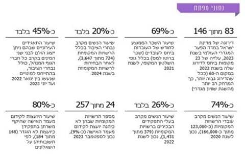 מניתוח הנתונים על תוצאות הבחירות לרשויות המקומיות בשנת 2024 עלה כי בראש כ-6% מהרשויות המקומיות בלבד (15 מתוך 257) עמדו נשים. אף כי חלה עלייה מסוימת בשיעור הנשים העומדות בראש רשות מקומית, שיעורן נותר נמוך, וזאת גם בהשוואה למדינות דמוקרטיות אחרות. כמו כן, לפי הנתונים על תוצאות הבחירות לרשויות המקומיות בשנת 2024, שיעורן של הנשים מקרב חברי מועצת הרשות המקומית היה כ-19% בעיריות ובמועצות מקומיות (493 מתוך 2,655) וכ-23% במועצות אזוריות (231 מתוך 992). שיעורן של הנשים מקרב חברי המועצה בכלל סוגי הרשויות המקומיות היה כ-20% (724 מתוך 3,647), לעומת כ-18% בשנת 2018, כ-13% בשנת 2013 וכ-11% בשנת 2008. בכשליש מהרשויות שנבדקו (83 מתוך 238) לא נבחרה אף אישה לכהן במועצת הרשות המקומית.