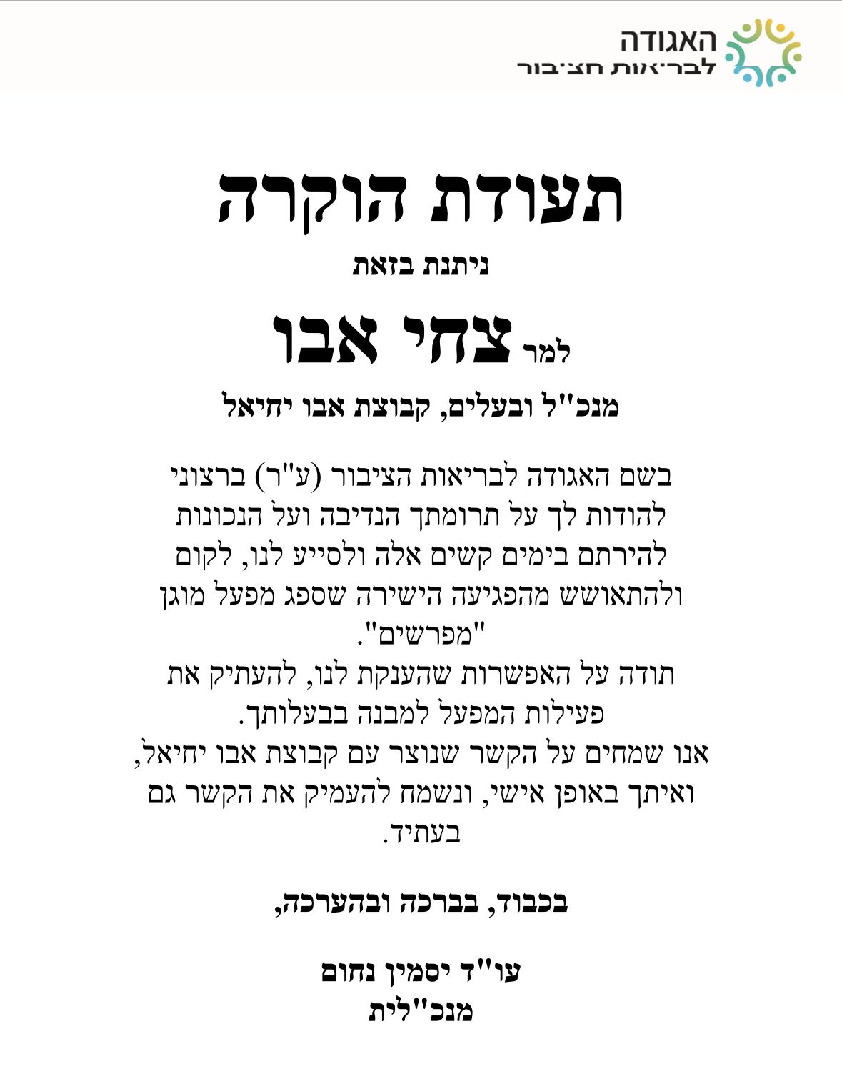 טקס במעמד האגודה לבריאות הציבור, עו״ד יסמין נחום, מנהל מפרשים, יהודה פליישר וצחי אבו מנכ"ל ובעלים קבוצת אבו יחיאל שכאמור תרם את המקום וזכה לתעודת הערכה מצד עו״ד נחום, בה נכתב: ״בשם האגודה לבריאות הציבור ברצוני להודות לך על תרומתך הנדיבה ועל הנכונות להירתם בימים קשים אלה ולסייע לנו, לקום ולהתאושש מהפגיעה הישירה שספג מפעל מוגן "מפרשים". תודה על האפשרות שהענקת לנו, להעתיק את פעילות המפעל למבנה בבעלותך. אנו שמחים על הקשר שנוצר עם קבוצת אבו יחיאל, ואיתך באופן אישי, ונשמח להעמיק את הקשר גם בעתיד".