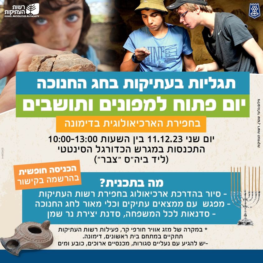 רשות העתיקות יחד עם אגף התרבות בעיריית דימונה, מזמינים אתכם לגלות עתיקות, להצטרף לסיור עם ארכיאולוג, לצפות בממצאים עתיקים ולהכין יצירות מיוחדות לחג החנוכה לכל המשפחה!