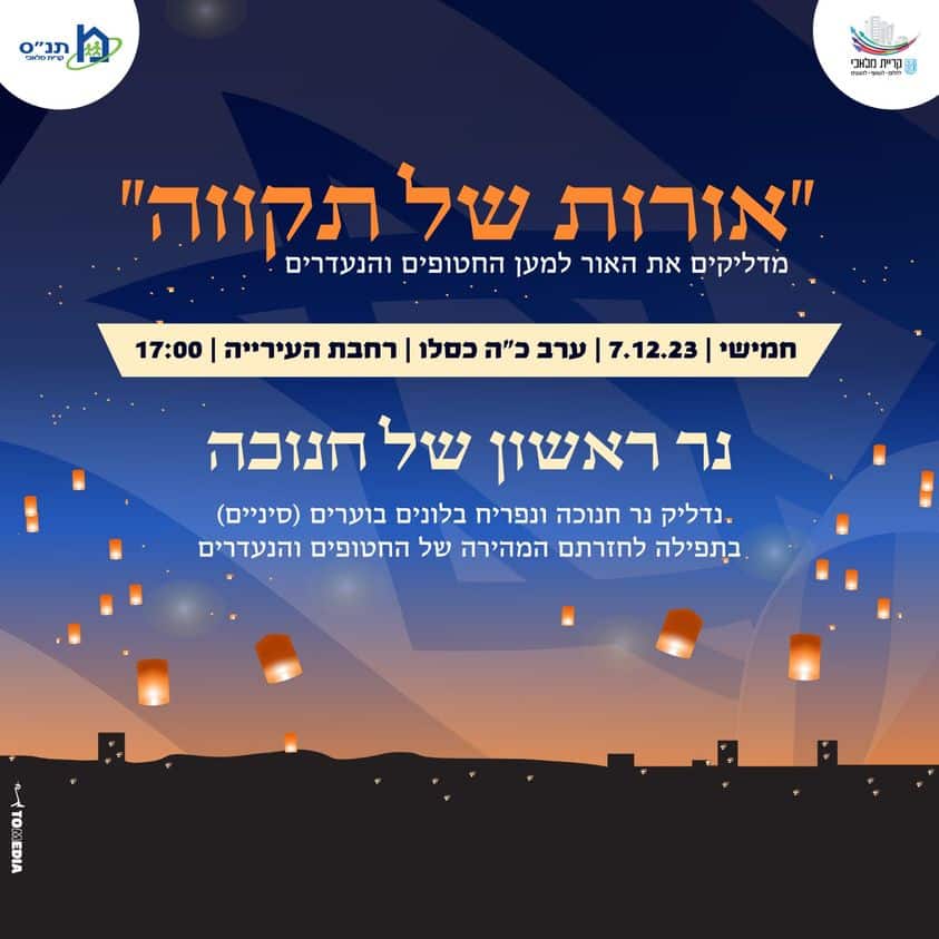 הערב, חמישי בשעה 17:00 (7.12, כ"ה כסלו) תושבות ותושבי העיר קרית מלאכי ייפגשו ברחבת העירייה בטקס אורות של תקווה. לאחר הדלקת נר ראשון של חנוכה, יחולקו לנוכחים בלונים סיניים בוערים בתפילה לחזרתם המהירה של החטופים והנעדרים שופרחו באוויר.