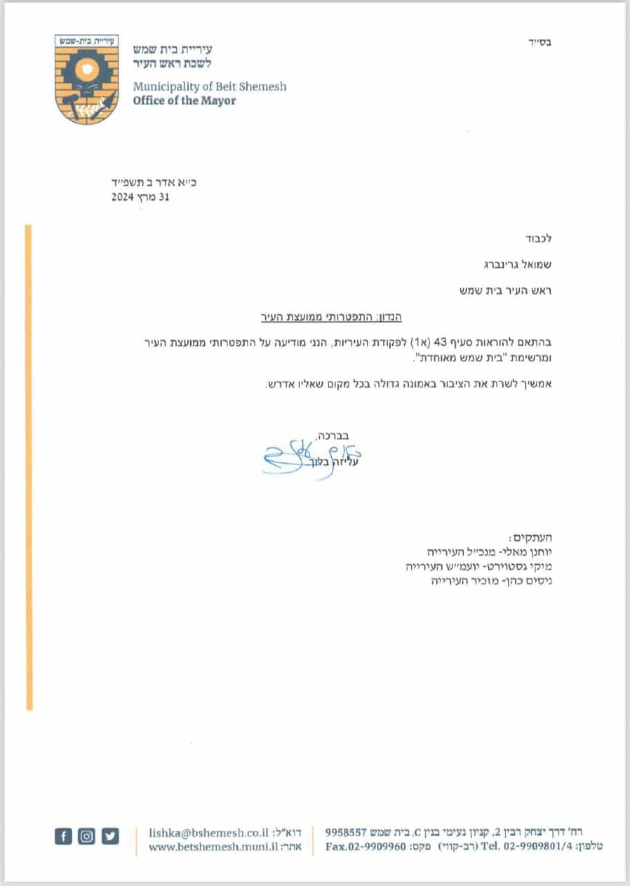 היום (ראשון, 31.3.) מודיעה בלוך כי החליטה להתפטר מכהונתה במועצת העיר בית שמש ומראשות סיעת 'בית שמש מאוחדת'.
