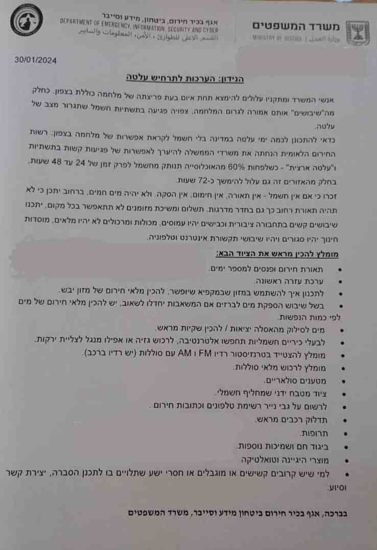 עוד מציינים, כי "רשות החירום הלאומית הנחתה את משרדי הממשלה להיערך לאפשרות של פגיעות קשות בתשתיות ו"עלטה ארצית" – כשלפחות 60% מהאוכלוסיה תנותק מחשמל לפרק זמן של 24 עד 48 שעות, בחלק מהאזורים בארץ זה גם עלול להימשך כ-72 שעות."