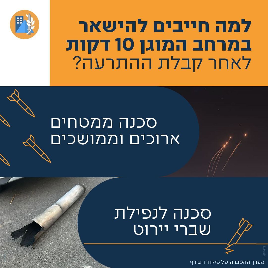 מהעירייה נמסר: "10 דקות מצילות חיים! כשנכנסים למרחב המוגן בעת אזעקה, חשוב מאוד לשמור על ההנחיות ולהישאר במרחב במשך 10 דקות. לא פחות. שברי היירוט, מתפזרים במשך כמה דקות ועלולים לגרום לפציעות וחלילה חמור מכך. אלו הנחיות מצילות חיים, ואסור לזלזל בהן".