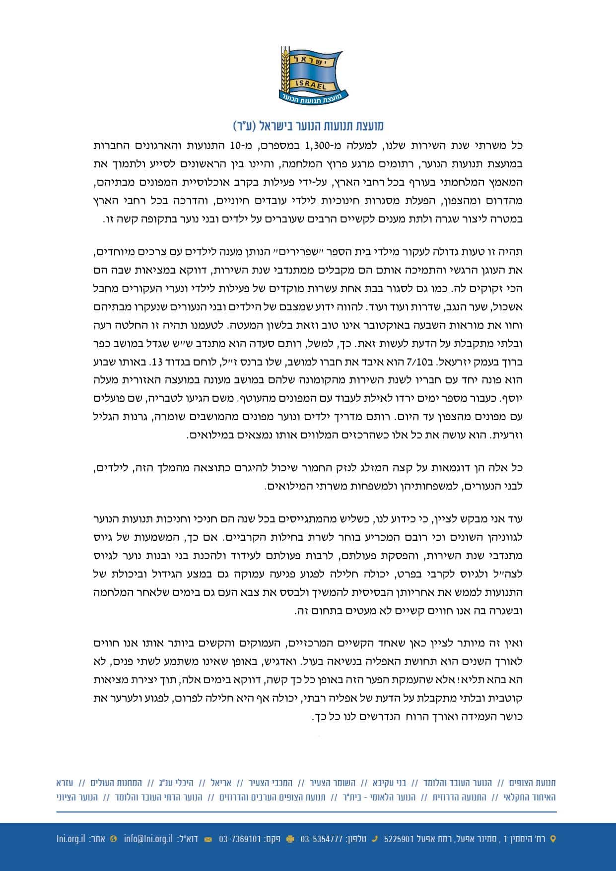 מועצת תנועות הנוער בישראל הוציאה מכתב בהול לשר הביטחון בעקבות ההודעה על הקדמת הגיוס של למעלה מ-1,300 משרתי שנת שירות.